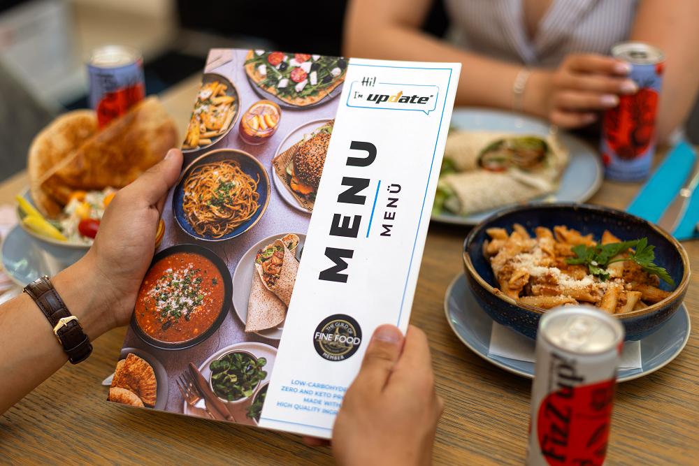 A menüben megtalálhatóak frissen sütött pékáruk, Update alapanyagokból készült brunch ételek, saláták, wrapek, főételek és szendvicsek. Minden étel gondosan válogatott összetevőkből készül.